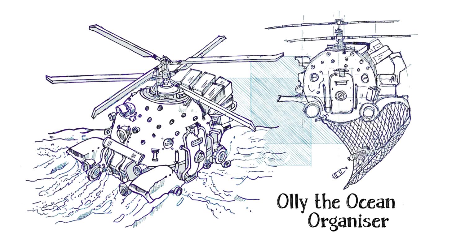 Olly is a machine that scours the ocean for rubbish and captures it in a giant net. Its inventor Daisy, a nine-year-old from the UK, writes that the machine would have solar-powered propellers and “eyes to see if there is any fish not to hurt them”.