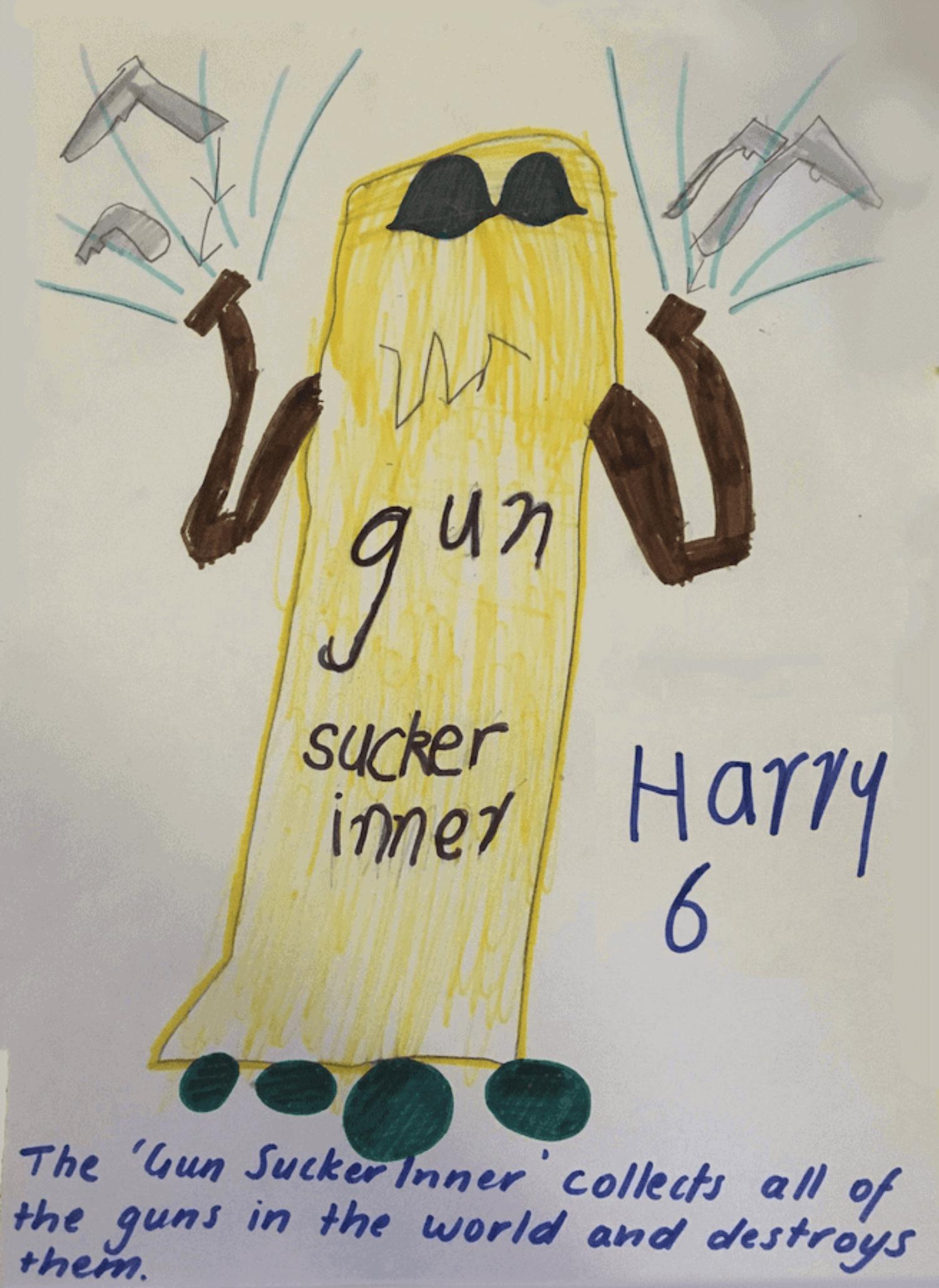 Six-year-old Harry from Australia imagines a vacuum-like device that sucks up all the guns in the world and destroys them in its dynamic body. The wheels at the bottom facilitate speedy transportation for where this powerful machine is most needed.