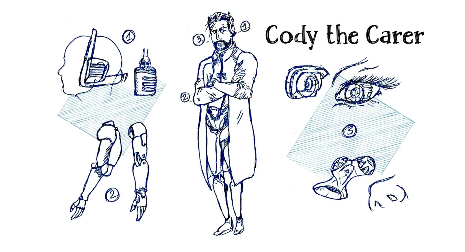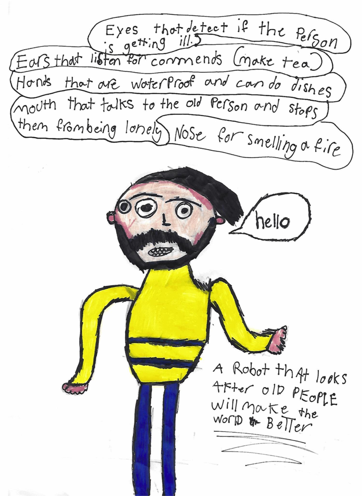 Laura came up with a benevolent robot that cares for elderly people and caters to their every need. Cody the Carer has “eyes that tell us if the person is getting ill, hands that are waterproof and can do dishes, and a mouth that talks to the old person and stops them from being lonely”.