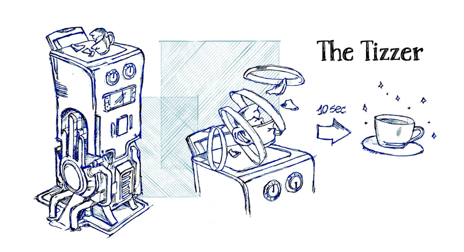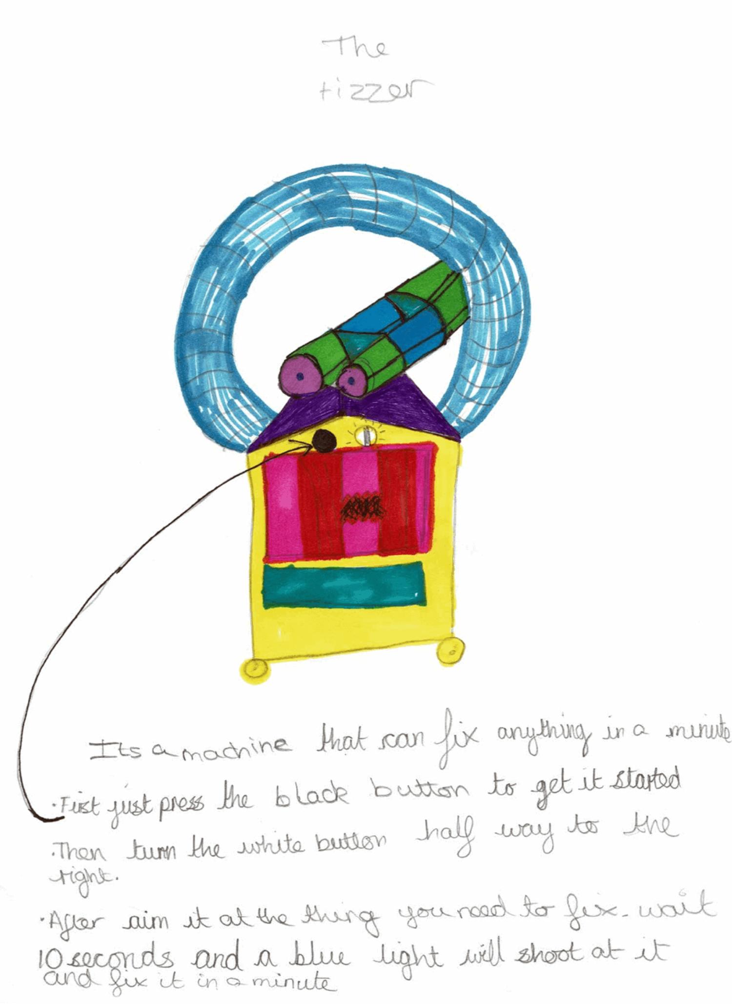 The Tizzer is a machine that can fix absolutely anything in a minute. Simply point it at the thing you want to fix, turn the white button and wait 10 seconds for the high-tech laser to start up and concentrate its special fixing rays on the broken object.