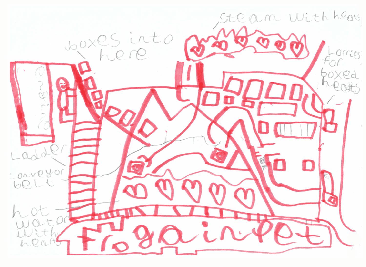 The Frogainpet works by mixing hearts and very hot water to create love, a special steam released into the air. Hearts not turned into steam are boxed up, moved along the conveyor belt and shipped out all around the world for people to enjoy.
