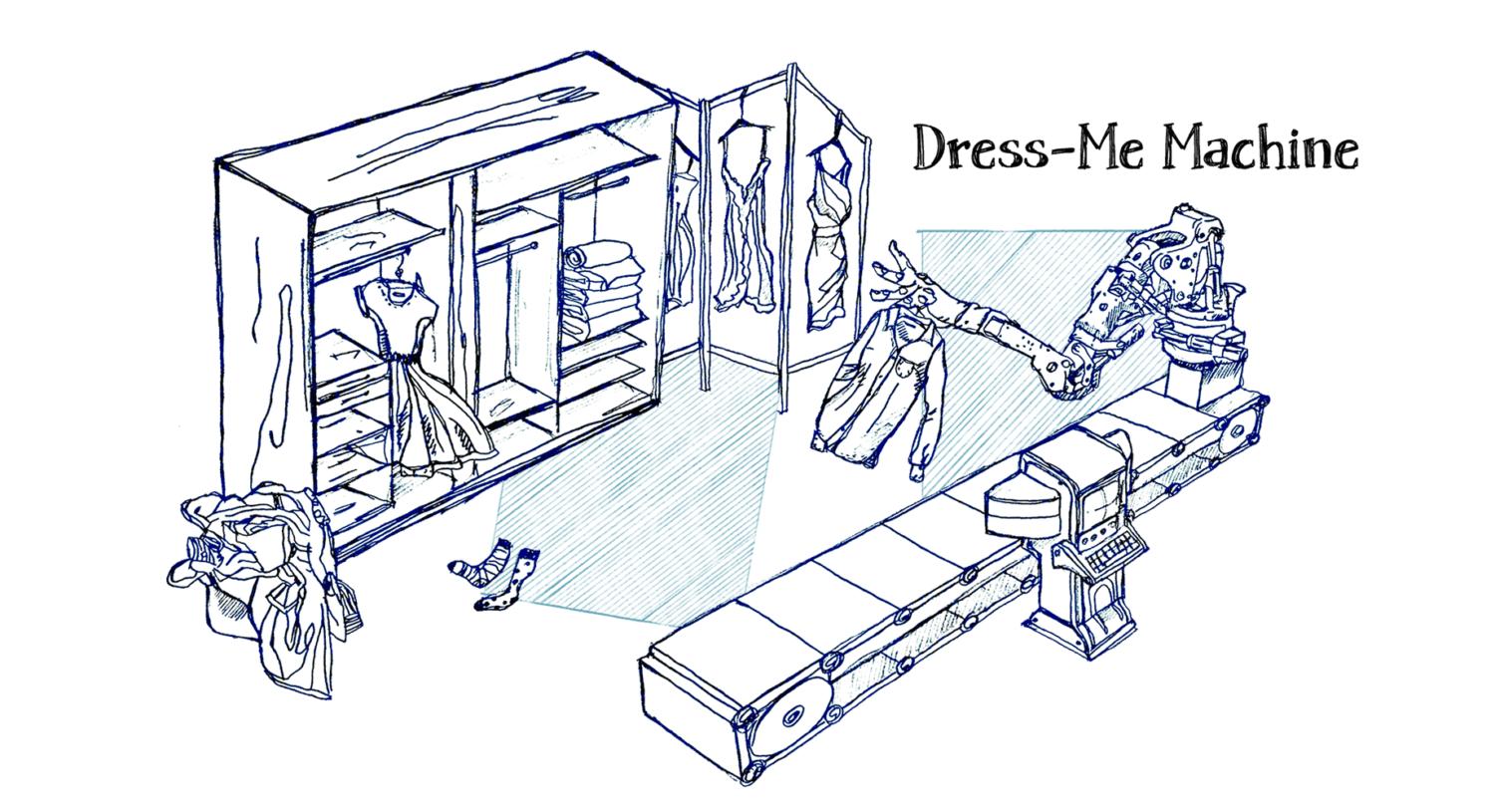 The Dress-Me Machine helps its operator get ready in the morning. Once your dream outfit is put together with the handy selector screen, the giant mechanical dressing arm pops your clothes on as you glide comfortably along the conveyor belt.