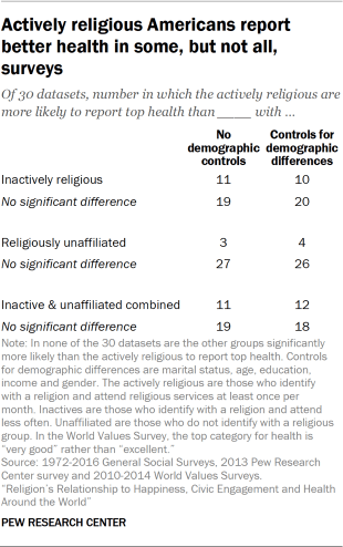 In 11 of the 30 datasets, when comparing the actively religious against a combined population of inactive and unaffiliated Americans, actively religious Americans are more likely to report top levels of health than all other Americans.
