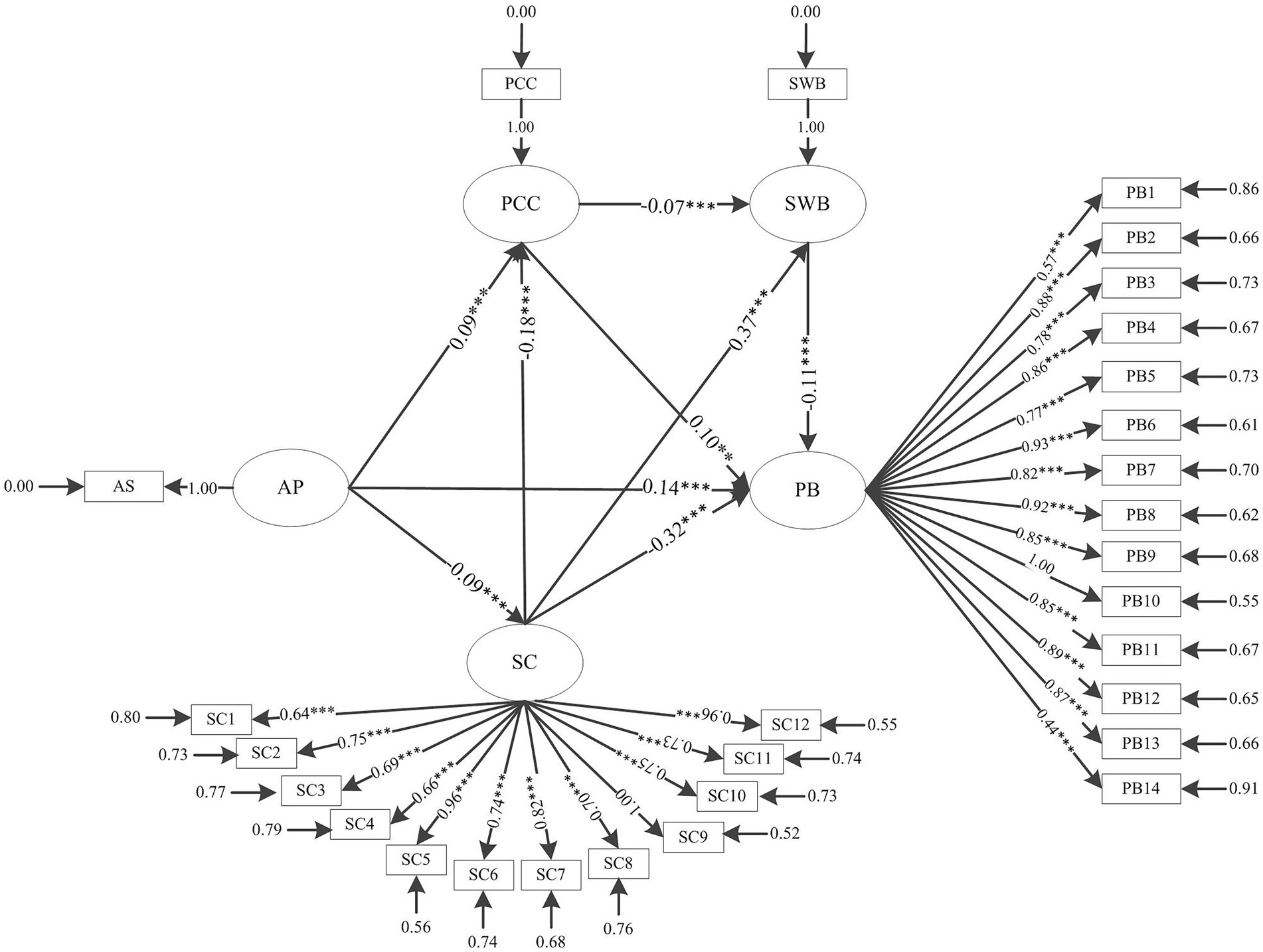 Figure 2. Structural equation modeling results. Note: AP, academic pressure (the influence of academic pressure on adolescent problem behavior); SC, self-control; PCC, parent–child conflict; SWB, subjective well-being; PB, problem behavior; **p < 0.01, ***p < 0.001.