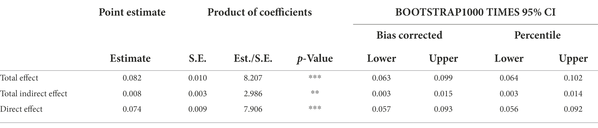 Table 5 shows the path of influence between academic pressure and adolescents’ problem behavior. The study found that academic pressure has a significant influence on adolescents’ problem behavior, with a total effect of 0.19 (p < 0.001) and a direct effect of 0.14 (p < 0.001). Hypothesis 1 is supported by the data. Academic pressure has a positive impact on parent–child conflict (β = 0.09, p < 0.001), and parent–child conflict also has a direct impact on adolescents’ problem behavior (β = 0.10, p < 0.01). It has a significant negative effect on subjective well-being (β = −0.07, p < 0.001), and subjective well-being can directly affect adolescents’ problem behavior (β = −0.11, p < 0.001). Therefore, academic pressure can positively affect adolescents’ problem behavior through parent–child conflict, and it can also affect adolescents’ problem behavioral through parent–child conflict and subjective well-being. Hypotheses 2, 3, and 7 are supported to some extent. In addition, academic pressure negatively affects self-control (β = −0.09, p < 0.001), while self-control directly affects adolescents’ parent–child conflict, subjective well-being, and problem behavior, with direct effects of −0.18, 0.37, and −0.32, respectively (p < 0.001). Therefore, academic pressure can affect adolescents’ problem behavior through self-control. The deviant behavior of teenagers can be influenced through self-control and parent–child conflict, but also through self-control, parent–child conflict, and subjective well-being. Therefore, hypotheses 4, 5, and 6 are supported to some extent.